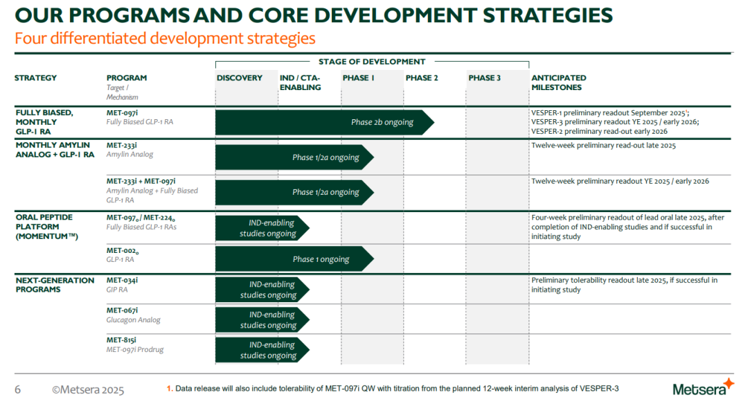 差异化的临床数据。MET-097i作为一种GLP-1受体激动剂,已进入Ⅱb阶段。2025年9月,公司发布了VESPER-1和VESPER-3两项IIb期临床试验中,该药显示出显著的体重减轻效果和良好的耐受性。