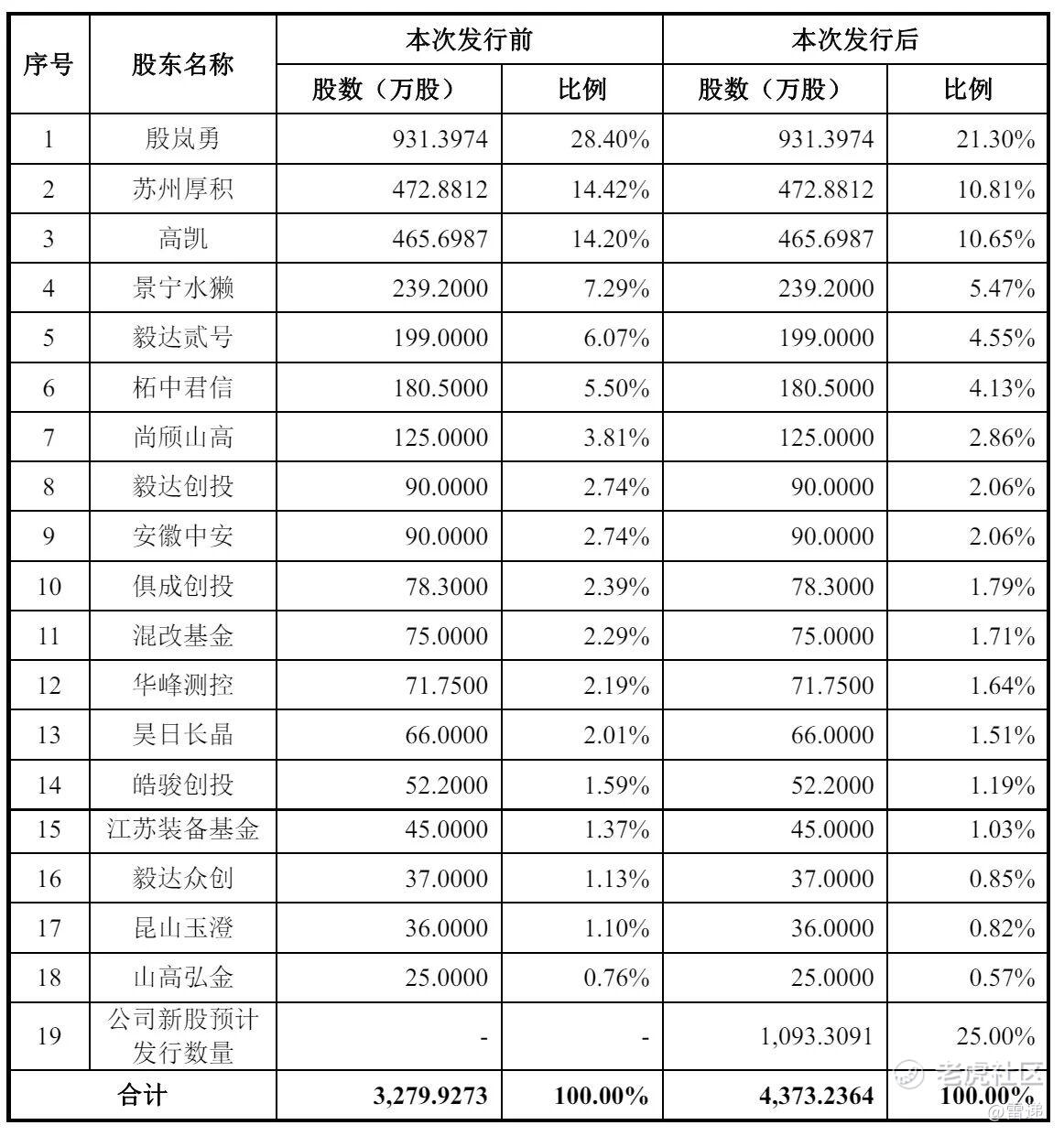 IPO后,殷岚勇持股为21.3%,苏州厚积持股为10.81%,高凯持股为10.65%,景宁水獭持股为5.47%,毅达贰号持股为4.55%,柘中君信持股为4.13%,尚颀山高持股为2.86%;