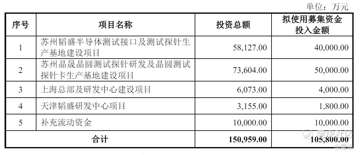韬盛科技计划募资10.58亿,其中,4亿用于苏州韬盛半导体测试接口及测试探针生产基地建设项目,5亿用于苏州晶晟晶圆测试探针研发及晶圆测试探针卡生产基地建设项目,4000万元用于上海总部及研发中心建设项目,1800万元用于天津韬盛研发中心项目,1亿元用于补充流动资金。