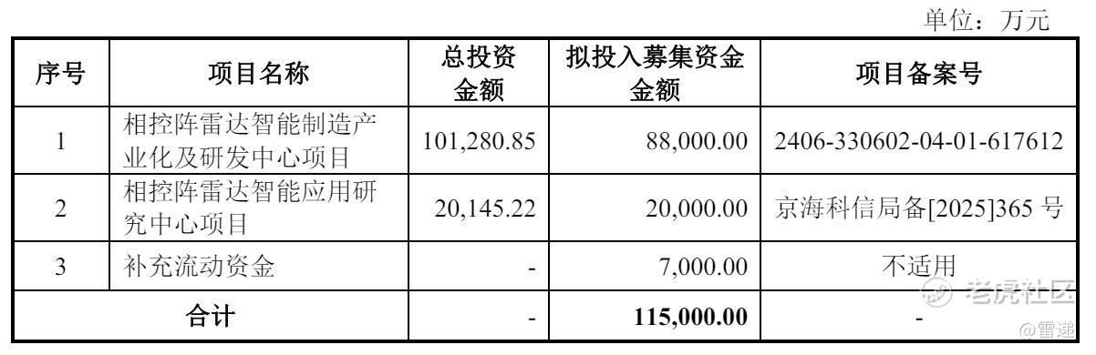华盛雷达计划募资11.5亿,其中,8.8亿用于相控阵雷达智能制造产业化及研发中心项目,2亿元用于相控阵雷达智能应用研究中心项目,7000万元用于补充流动资金。