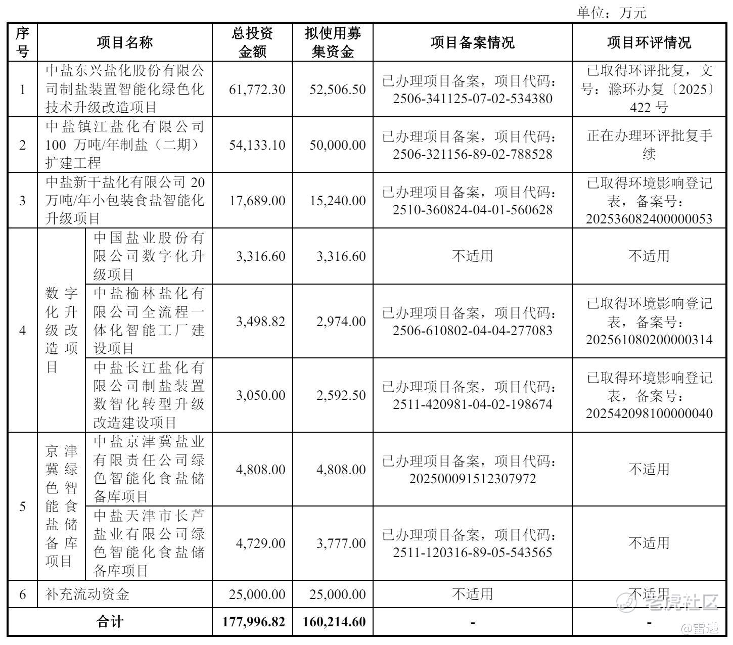 中盐股份计划募资16亿,其中,5.25亿用于中盐东兴盐化股份有限公司制盐装置智能化绿色化技术升级改造项目,5亿元用于中盐镇江盐化有限公司100 万吨/年制盐(二期)扩建工程,1.5亿用于中盐新干盐化有限公司 20万吨/年小包装食盐智能化升级项目,2.5亿用于补充流动资金。