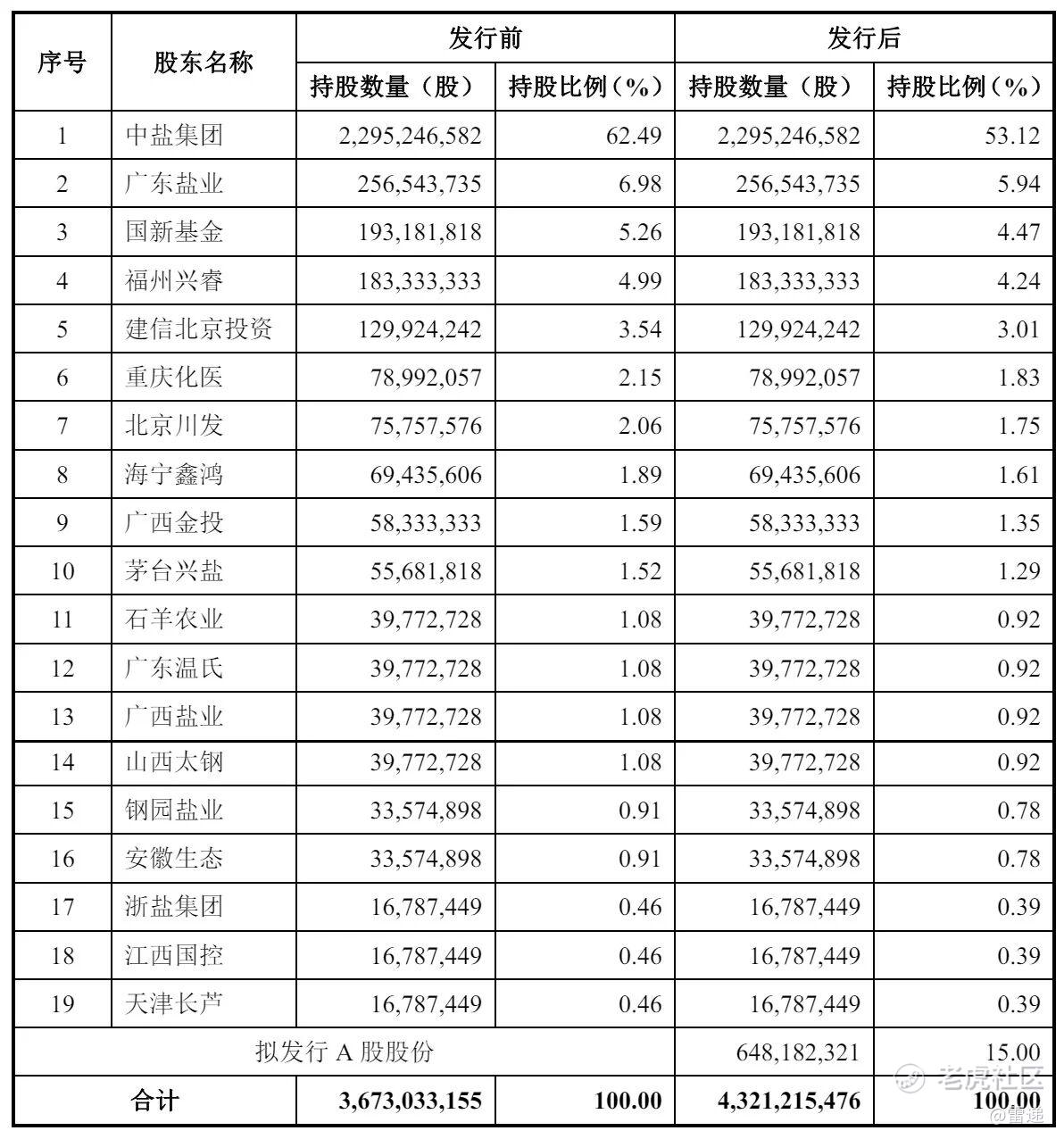 IPO后,中盐股份持股为53.12%,广东盐业持股为5.94%,国新基金持股为4.47%,福州兴睿持股为4.24%,建信北京投资持股为3.01%,重庆化医持股为1.83%,北京川发持股为1.75%;