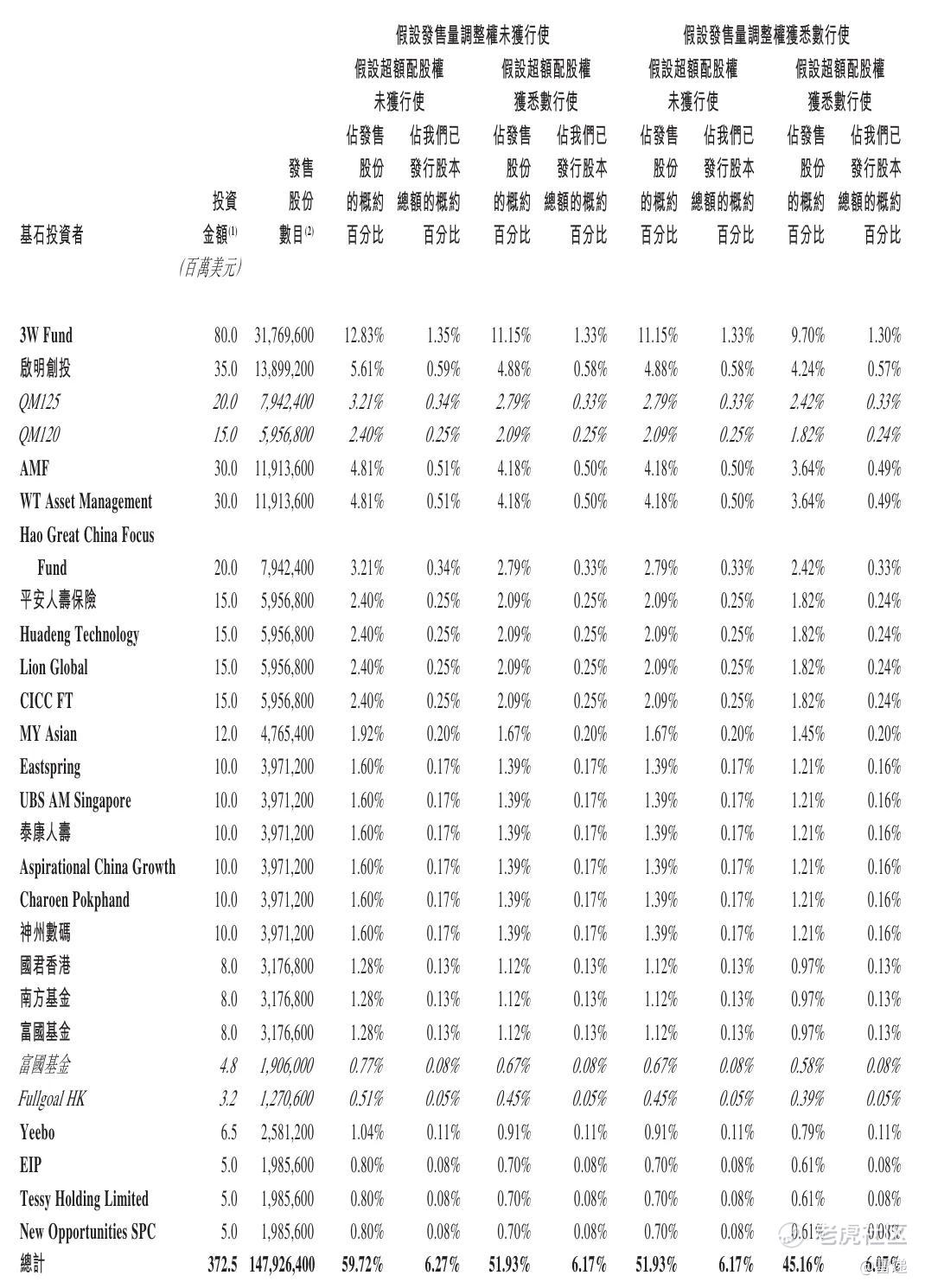 MY Asian认购1200万美元,Eastspring、UBS AM Singapore、泰康人寿、Aspirational China Growth、Charoen Pokphand、神州数码分别认购1000万美元,国君香港、南方基金、富国基金分别认购800万美元,Yeebo认购650万美元,EIP、New Opportunities SPC认购500万美元。