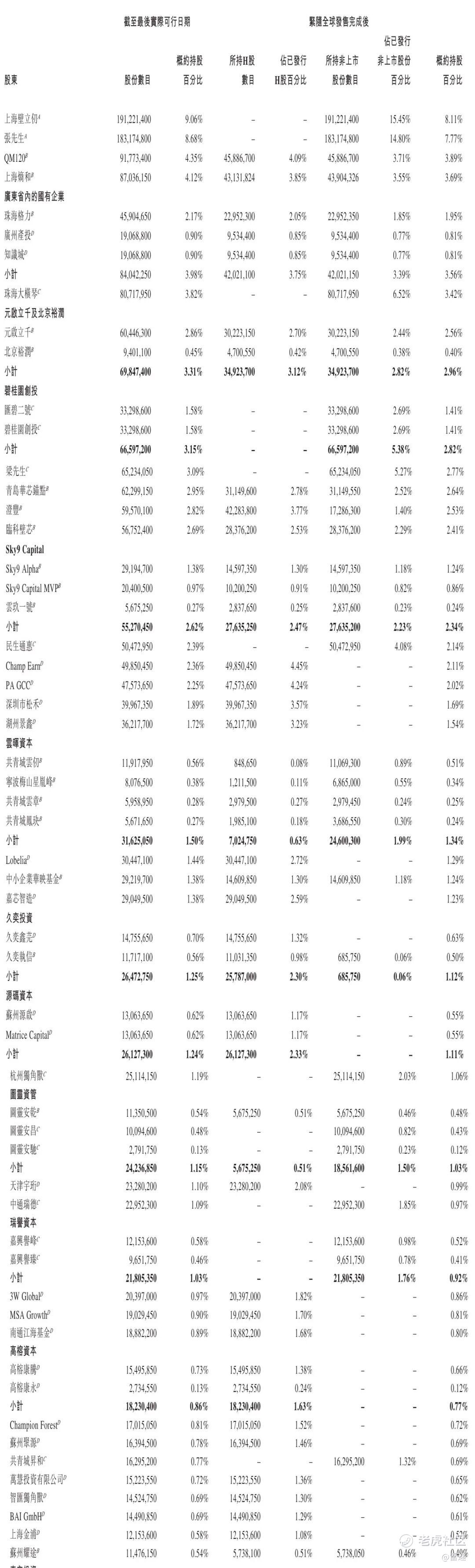 碧桂园创投持股为2.82%,梁晓峣持股为2.77%,青岛华芯锚点持股为2.64%,澄丰持股为2.53%,临科壁芯持股为2.41%,Sky9 Capital持股为2.34%,民生通惠持股为2.14%,Champ Earn持股为2.11%,PA GCC持股为2.02%,深圳市松禾持股为1.69%,湖州景鑫持股为1.54%。