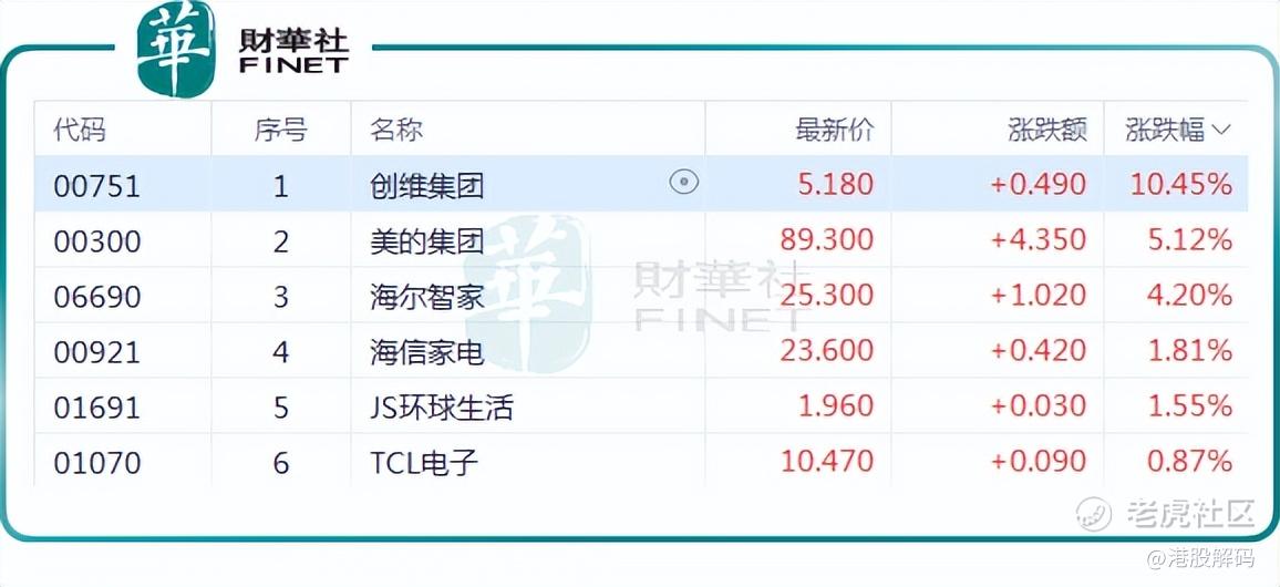 2026年1月2日,港股家电股集体冲高。截至收盘, $创维集团(00751)$ 涨10.45%, $美的集团(00300)$ 涨5.12%, $海尔智家(06690)$ 涨4.2%,海信家电(00921.HK)涨1.81%,JS环球生活(01691.HK)涨1.55%,TCL电子(01070.HK)跟涨。