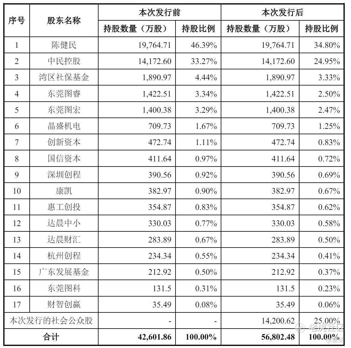 IPO后,陈健民持股为34.8%,中民控股持股为24.95%,湾区社保基金持股为3.33%,东莞图睿持股为2.5%,东莞图宏持股为2.47%,晶盛机电持股为1.25%,创新资本持股为0.83%,国信资本持股0.72%;
