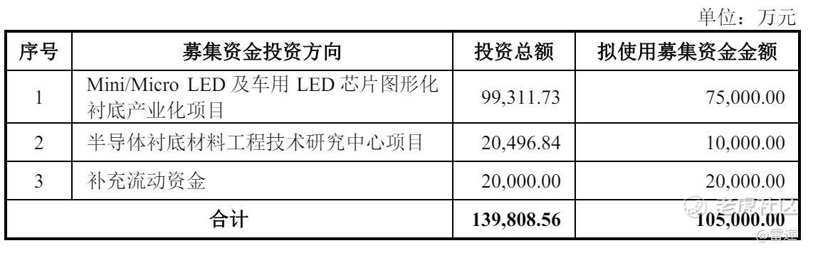 中图科技计划募资10.5亿,其中,7.5亿用于Mini/Micro LED 及车用 LED 芯片图形化衬底产业化项目,1亿元用于半导体衬底材料工程技术研究中心项目,2亿元用于补充流动资金。