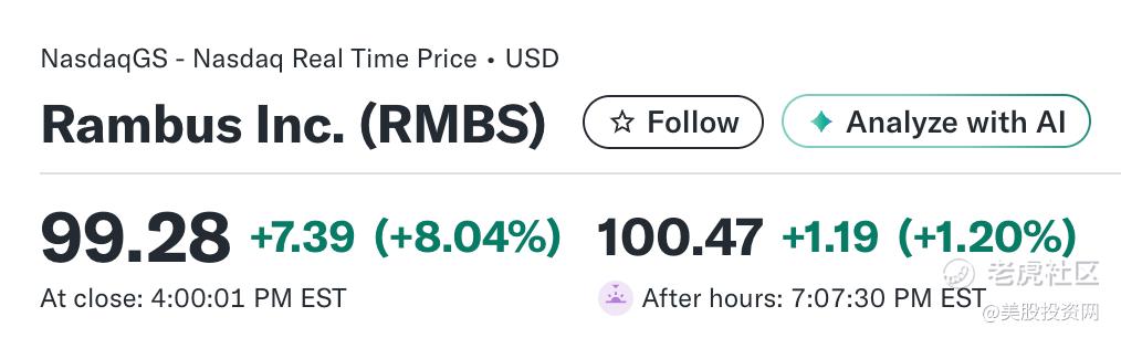 高速内存接口芯片和硅知识产权公司RMBS大涨超8%,现在股价已经站上100美元。我们当时公布的价格仅仅93美元。