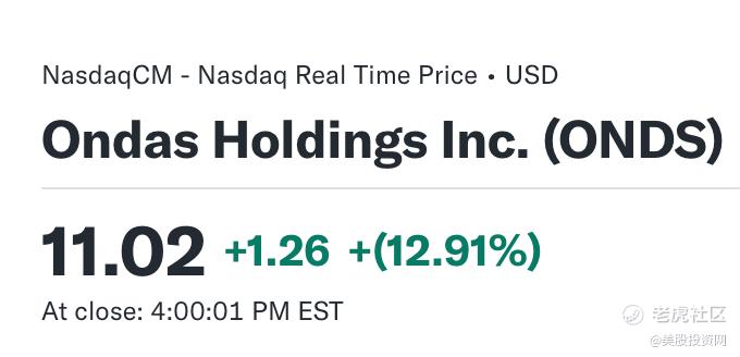 国防级无人机平台公司 $Ondas Holdings Inc.(ONDS)$ 收盘大涨近13%,报收11.02美元,本周涨幅已经顶到了20%以上!