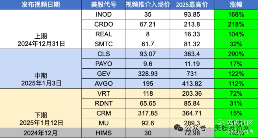 6月必买 LLY,741美元买价,最高价格 1111.99 美元,涨幅 50%;6月必买 谷歌,166美元买价,最高价格328.46 美元,涨幅 102%;7月必买 AMD,130美元买价,最高价格 263.51 美元,涨幅 97%。