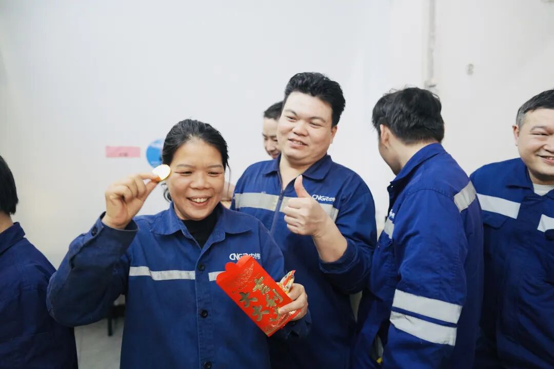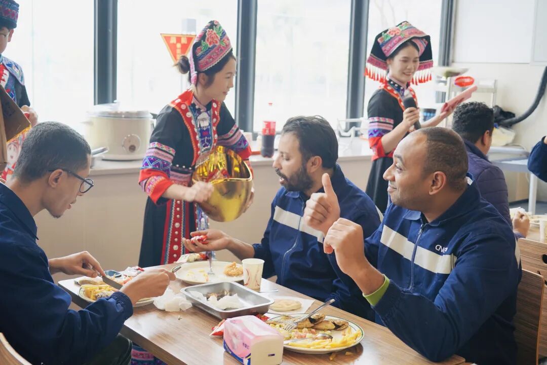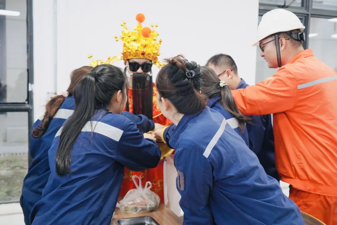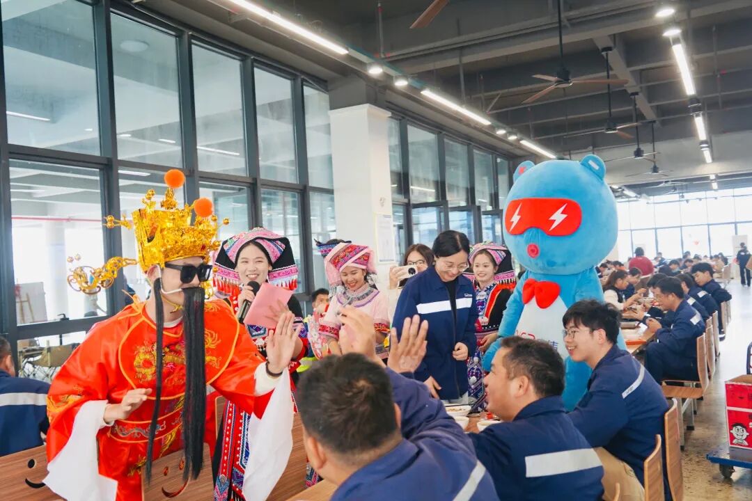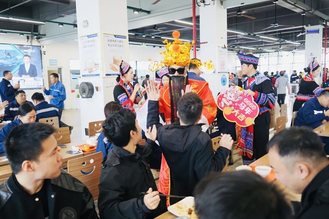 基地形象大使团也迎来了“惊艳首秀”。他们与活泼可爱的“锂电宝宝”、喜气洋洋的“财神爷”共同集结,组成了一支活力满满的送福小分队。在浓厚的节日氛围中,这支“福气天团”通过创意十足的互动与沉浸式文化体验,正式拉开了基地辞旧迎新、共赴新篇的华丽序幕。“互动体验巡游”环节点燃了全场最高热情。员工们争相与“财神爷”大力击掌、拥抱“金元宝”,在响亮的掌声中“掌”握新年好彩头。“接福挑战”更是一场智慧与默契的较量,大家妙语连珠,接力送出“一马当先”的节日祝福。摩洛哥同事也深受感染,热情加入其中,中外伙伴欢聚一堂,在欢声笑语间绘就了一幅跨越国界的文化交融新春图景。