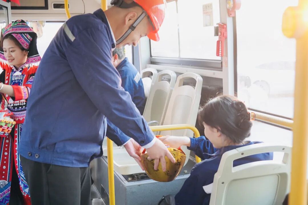 伴着喜庆的乐曲,由形象大使团精心装扮的“福运直通车”缓缓启动。基地班子成员与送福小分队化身“新春使者”,深入厂区各分餐点,将一份份满载关怀的特色巧克力金币红包与新年福袋亲手交给一线员工,2026年的“第一份甜蜜”在厂区的每一个角落传递。花车所到之处,不仅是一道流动的风景,更将“财源广进、好运随行”的美好寓意传递至员工们的心里。