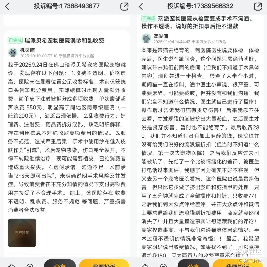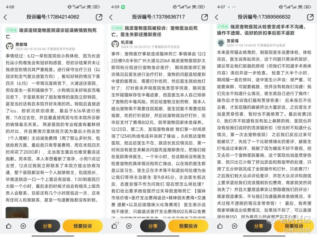 不过,亮眼业绩的背后,藏着快速并购扩张留下的“后遗症”。公司曾与收购医院的原团队闹过官司;与此同时,黑猫投诉平台上关于瑞派宠物的抱怨已累计超90条,从诊疗不当、收费混乱到售后推诿,各类问题层出不穷。