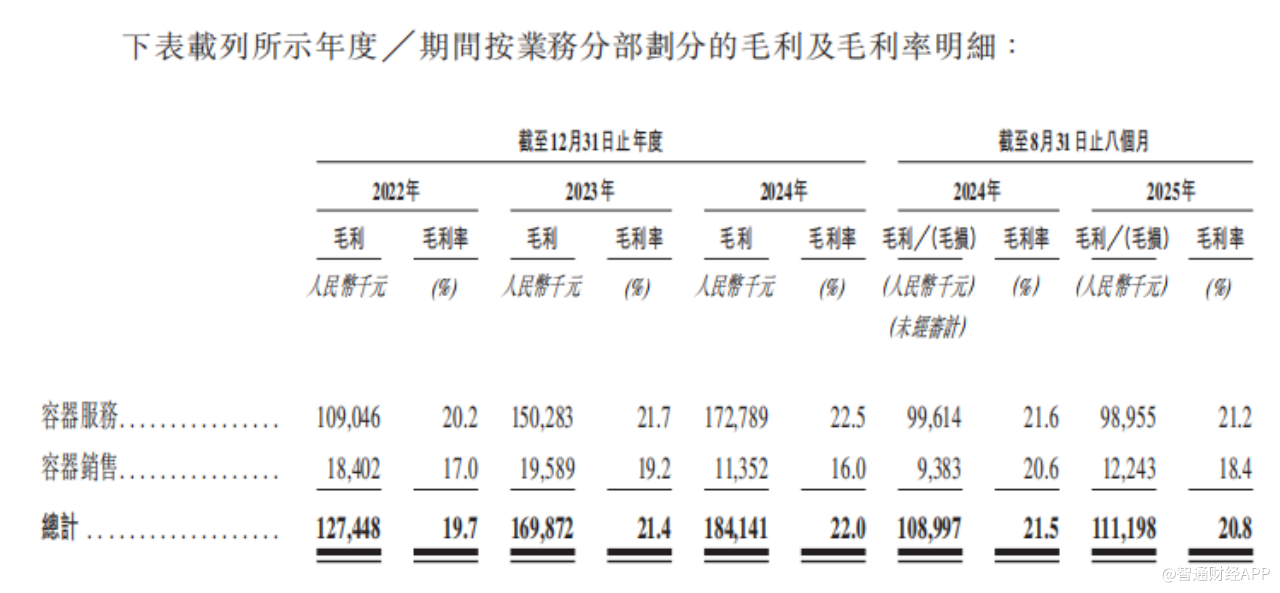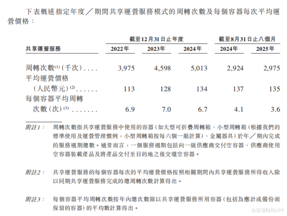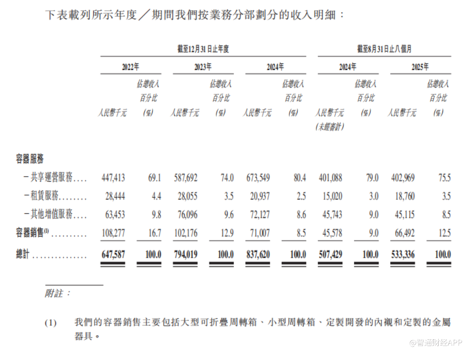 容器销售业务以具有物流能力和采购需求的客户为目标,直接向其供应公司的产品,其中主要包括循环大型可折叠周转箱、小型周转箱、定制开发的内衬和定制的金属器具。2025年前8个月,容器销售业务实现收入6649.2万元(人民币,下同),占总营收的12.5%。