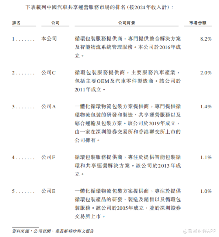 从行业地位来看,据弗若斯特沙利文数据,按2024年收入计算,公司是中国循环包装服务第二大提供商,市场份额1.5%;公司在中国汽车共享运营服务市场排名首位,市场份额为8.2%。