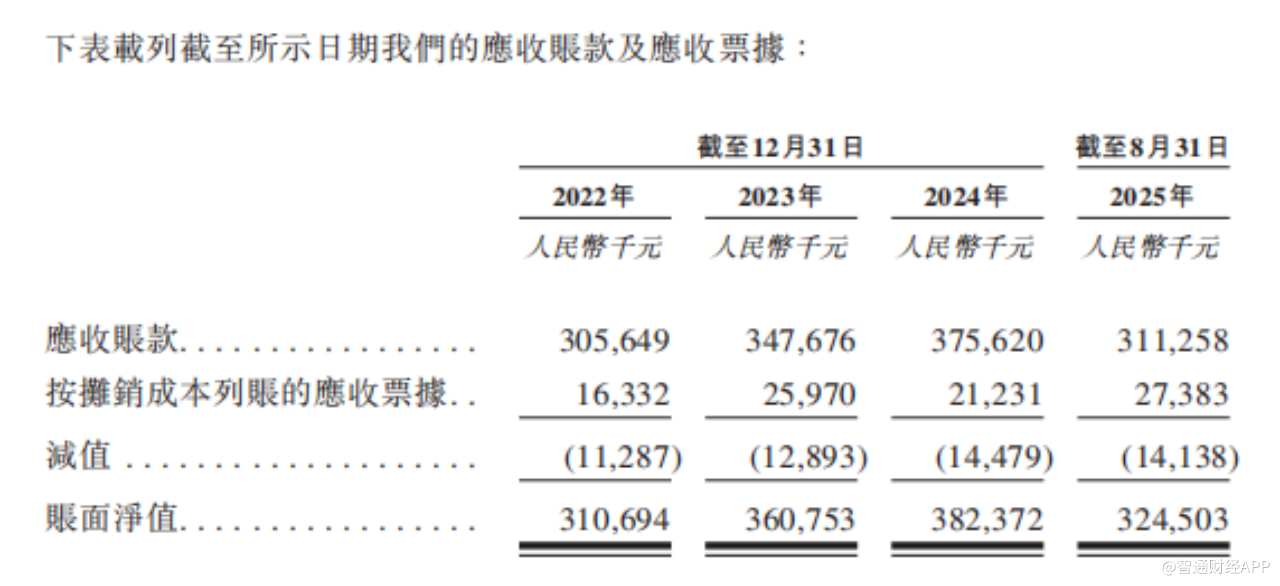 值得注意的是,优乐赛的应收账款及应收票据也长期维持在高位。报告期内,公司的应收账款及应收票据账面净值分别为3.11亿元、3.61亿元、3.82亿元及3.25亿元。其中,2025年前8个月的应收账款占营收比重超过60%。同期,公司账款及应收票据周转天数分别为168.3天、159.9天、167.9天及167.8天;公司应收账款的减值金额分约为0.11亿元、0.13亿元、0.14亿元及0.14亿元。