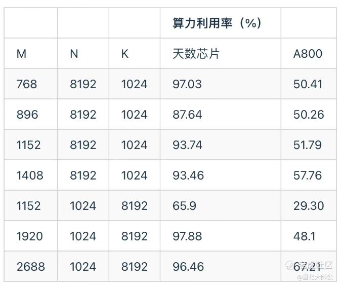 基于ByteMLPerf 中几种常用的矩阵规模,在多种典型规模下,天数芯片能够维持较高的算力利用率,特别是在大尺寸矩阵计算中,其计算阵列能够得到充分发挥,表现出较强的硬件效率稳定性。
