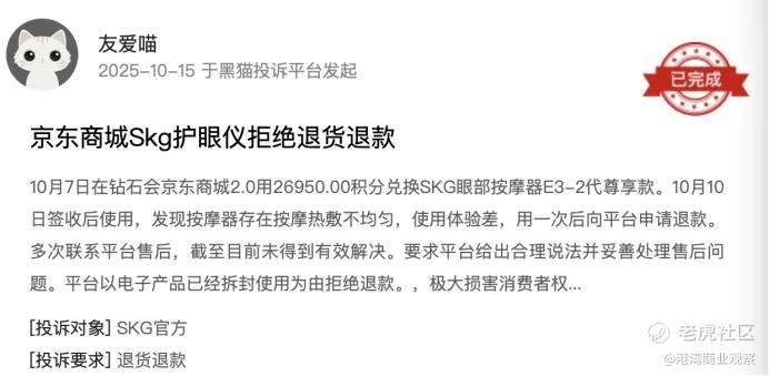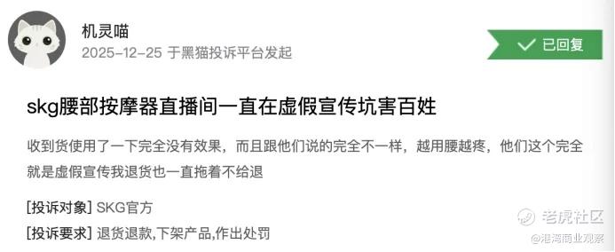 近日,SKG腰部按摩器的性能也受到质疑,有一消费者于2025年12月25日于天猫投诉平台表示,SKG腰部按摩器直播间存在虚假宣传,其产品使用后不仅没有效果,反而加重了腰部疼痛。