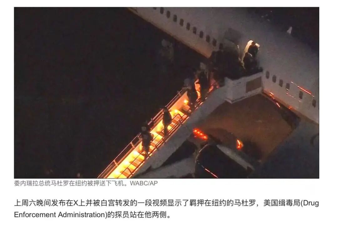 上周六晚间发布在X上并被白宫转发的一段视频显示了羁押在纽约的马杜罗,美国缉毒局(Drug Enforcement Administration)的探员站在他两侧。