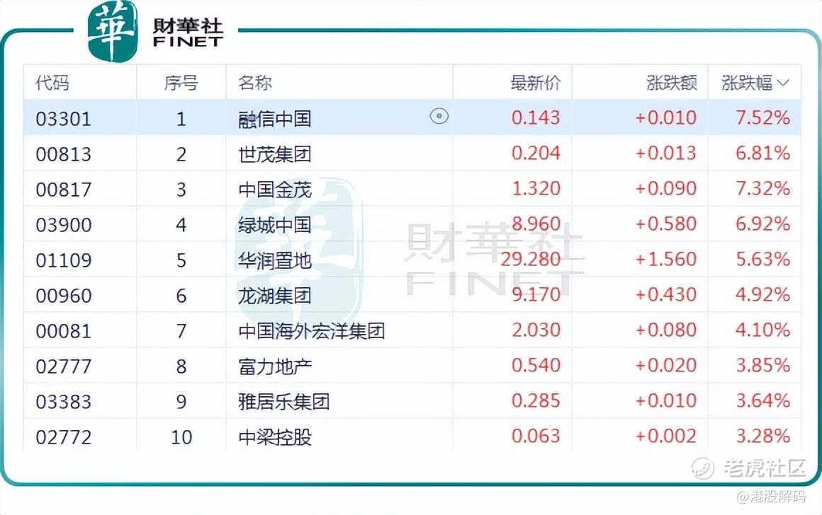 1月5日,港股内房股板块涨势最为犀利,截至发稿前,该板块涨幅达4.13%。其中, $融信中国(03301)$ 涨7.52%, $世茂集团(00813)$ 涨6.81%, $中国金茂(00817)$ 涨7.32%,绿城中国(03900.HK)涨6.92%,华润置地(01109.HK)涨5.63%,龙湖集团(00960.HK)涨4.92%,中国海外宏洋集团(00081.HK)涨4.1%,万科企业(02202.HK)、新城发展(01030.HK)等股均加入这波上涨浪潮。