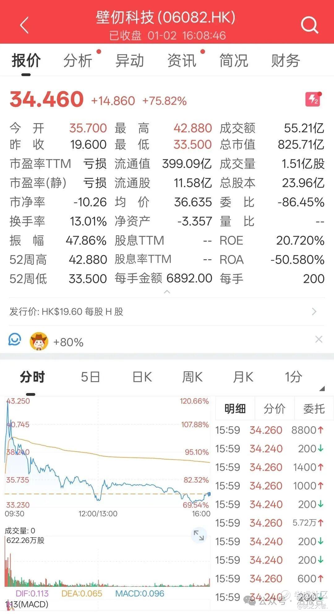 上市首日,公司股价高开82.14%,报35.70港元,开盘后最高涨至42.88港元,日内最高涨118.78%,市值一度突破千亿港元。但盘中持续回落,涨幅收窄,最终收至34.46港元,收涨75.82%。