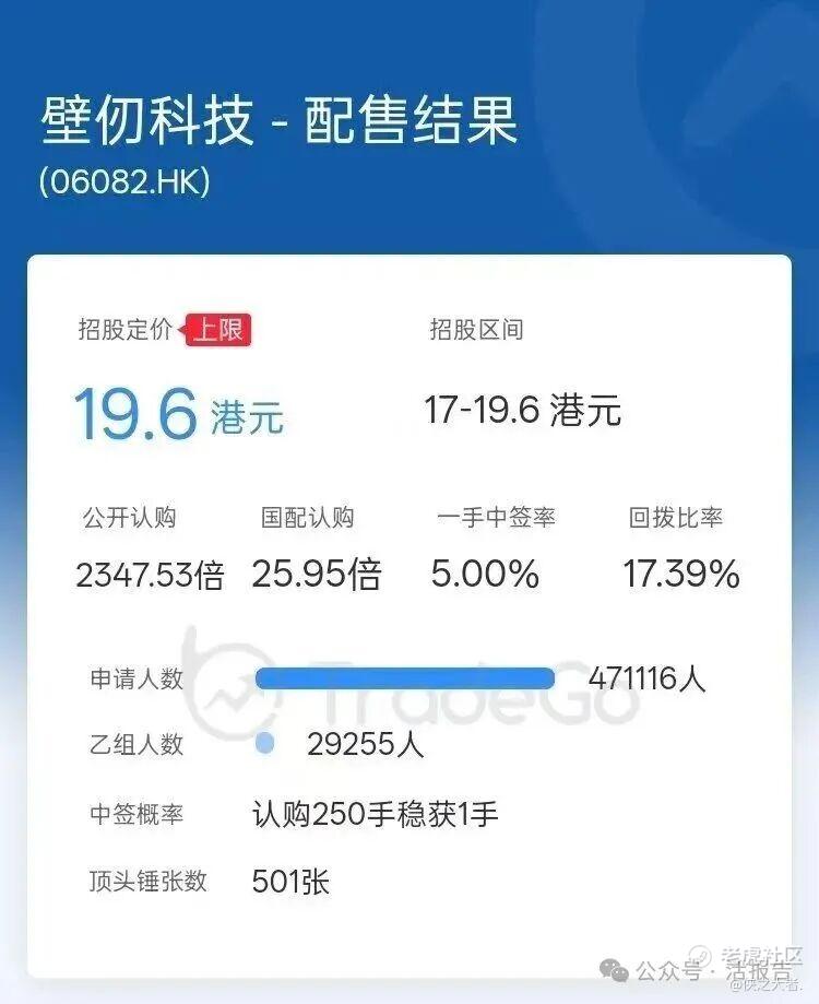 壁仞科技的中签人数高达13.56万人。配售结果显示,公司本次申购人数共471,116人,创下2025年认购人数的新高,其中135,569人中签。公开认购2347.53倍,国配认购25.95倍,公开回拨至20%,一手中签率仅5%。