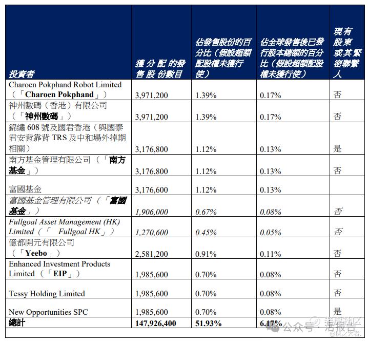 公司募资总额约55.83亿港元;有23家基石投资者参与,包括3W Fund、启明创投、WT Asset Managemen、平安人寿保险、神州数码、泰康人寿、富国基金等,合计参投约28.99亿港元,占全球发售的51.93%。