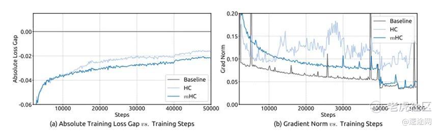结果表明,mHC 在损失和梯度范数方面都表现出更高的稳定性