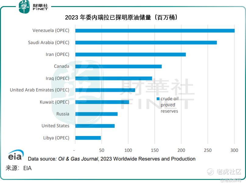 根据美国能源信息署(EIA)的数据,于2023年,委内瑞拉已探明原油储量居于世界首位,越达3,030亿桶,约占全球储量的17%,见下图。
