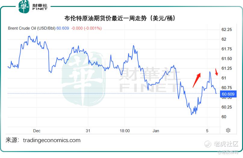 如前文所述,委内瑞拉尽管拥有全球最大的石油储量,但由于近年原油产量不高——占全球产量不到1%,暂时停产对全球原油供应的影响应不大。潜在影响或在于美国对其他产油国的压力,包括伊朗,加上OPEC+八国暂停增产,市场或担心会令原油供应收紧,布伦特原油期货价格一度冲上每桶61美元以上水平,但随后回落,现报每桶60.61美元,见下图,短期波动幅度较大。