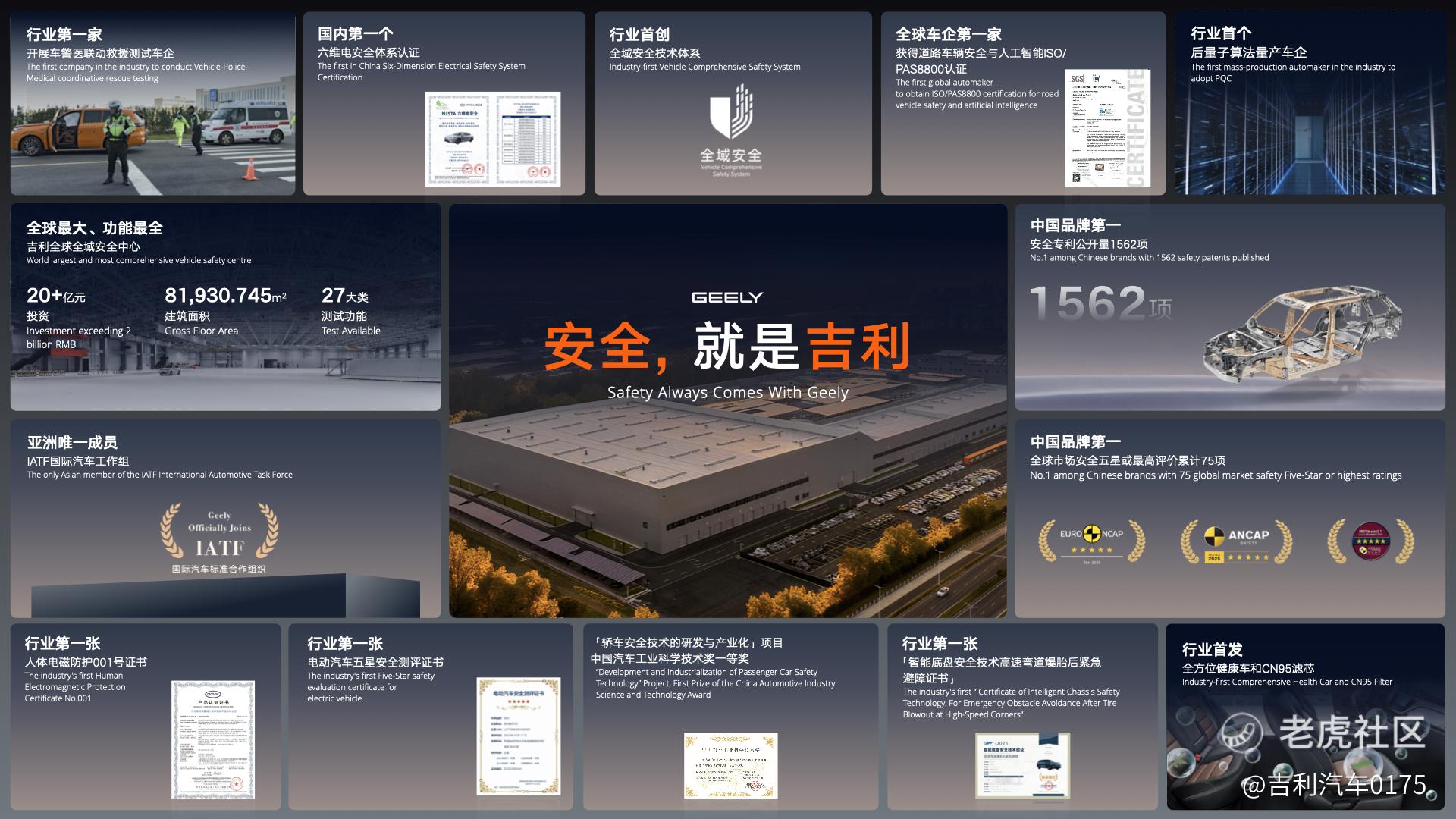 安全领域,吉利汽车集团秉持“用户至上,安全第一”的造车核心价值观,在全域AI技术体系赋能下,正式迈入全域安全2.0时代。进阶打造的“全域安全2.0”技术体系,深度融合全域AI,通过技术升级、能力突破与范式创新,将侧重“整车安全”的视角升级为“人-车-路-云-星”的生态视角,构建起全方位保障消费者安全的技术体系。还有全球建筑面积最大、验证能力最全的吉利全球全域安全中心也正式发布,以五大吉尼斯世界纪录,树立全球汽车安全领域的行业标杆,并面向全行业开放共享,将吉利近30年在新能源安全、辅助驾驶安全等关键领域的技术实践和验证标准开放分享给行业伙伴,以开放姿态助力全行业筑高汽车安全防线。