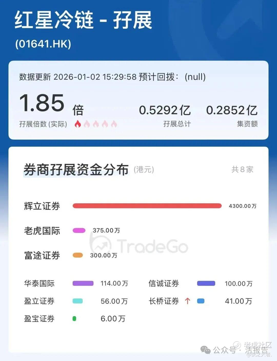 据TradeGo新股孖展数据,截至1月2日15时,红星冷链孖展总额约0.53亿港元,孖展认购倍数约1.85倍,认购已足额。其中,辉立证券、老虎国际、富途证券分别放出4300万、375万、300万港元。