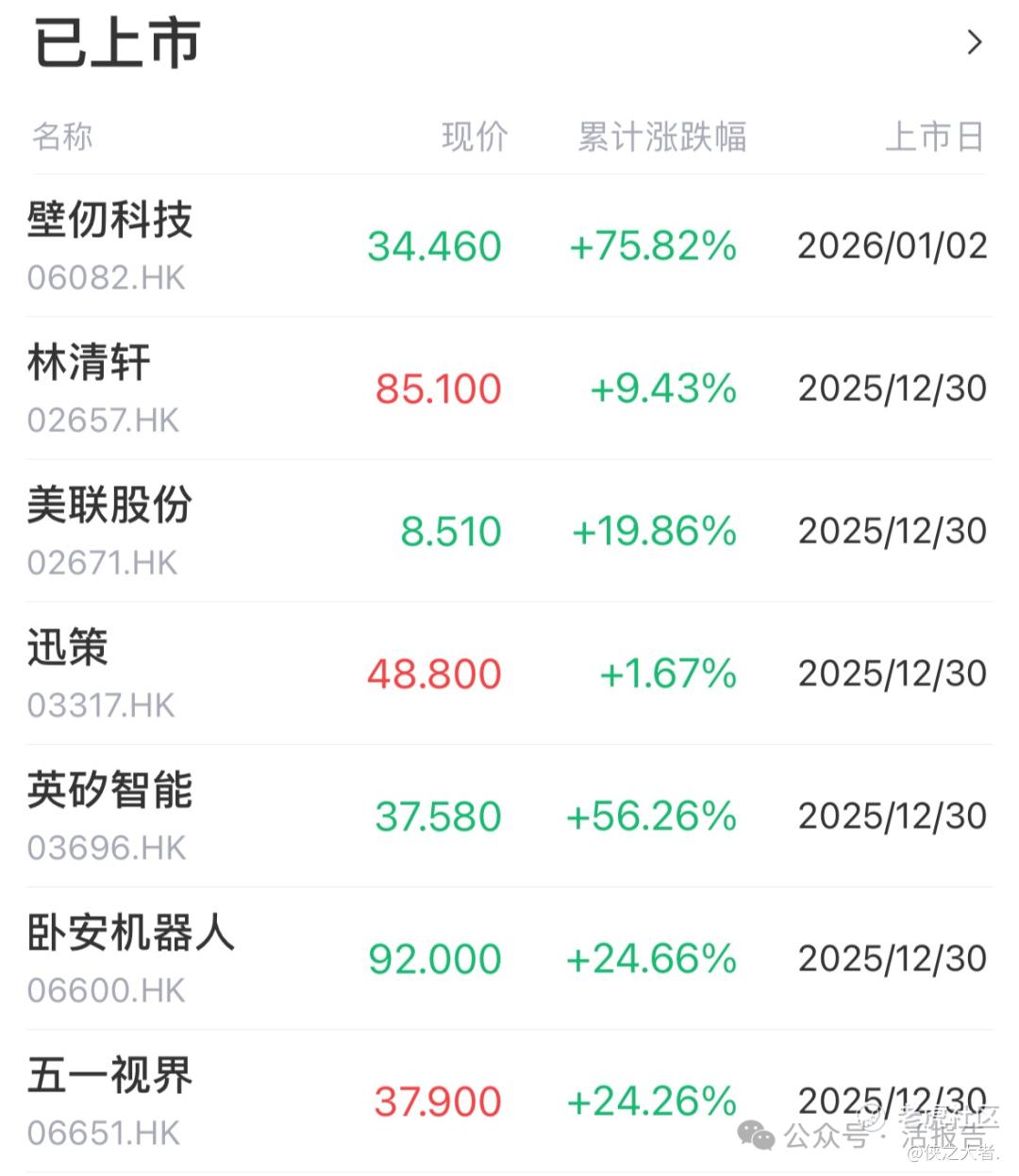 近一周,壁仞科技、林清轩、美联股份、迅策、英矽智能、卧安机器人、五一视界等7只新股上市,并录得全线上涨!其中,壁仞科技上市首日股价大涨75.82%,市值一度突破千亿港元,首日成交额超55亿港元。