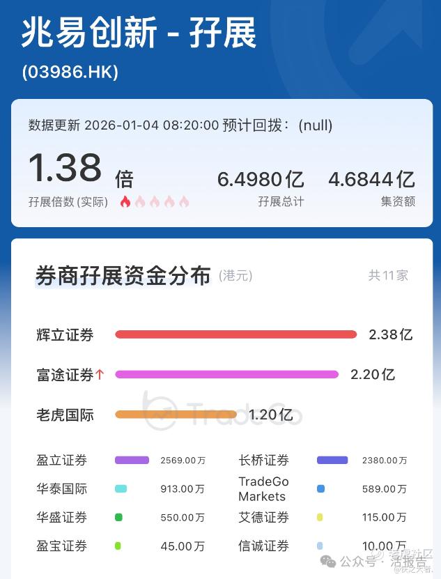 据TradeGo新股孖展数据,截至1月4日8时,兆易创新孖展总额已达6.5亿港元,孖展认购倍数约1.38倍,认购已足额。其中,辉立证券、富途证券、老虎国际分别放出2.38亿、2.2亿、1.2亿港元。