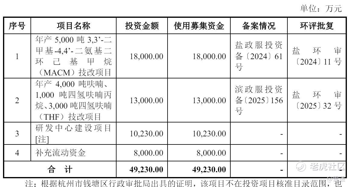 清泉股份计划募资4.92亿元,其中,1.8亿元用于年产5,000吨3,3'-二甲基4.4.二氨基二环己基甲烷(MACM)技改项目,1,3亿元应用于年产4,000吨呋喃、1.000吨四氢呋喃丙烷、3.000吨四氢呋喃(THF)技改项目,1亿元用于研发中心建设项目,8000万元用于补充流动资金。