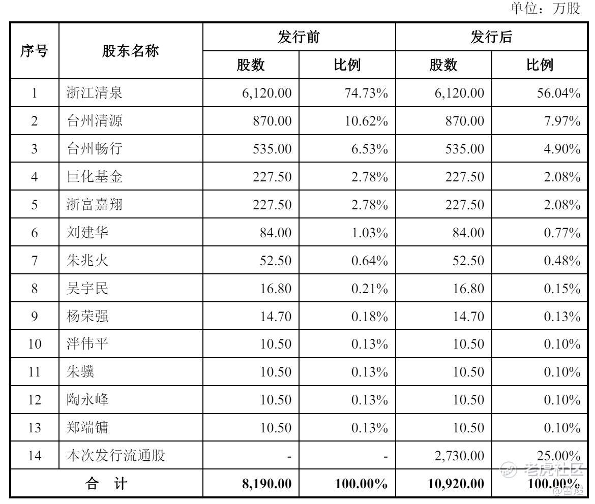 IPO后,浙江清泉持股为56.04%,台州清源持股为7.97%,台州畅行持股为4.9%,巨化基金、浙富嘉翔分别持股为2.08%,刘建华持股为0.77%,朱兆火持股为0.48%,吴宇民持股为0.15%,杨荣强持股为0.13%,泮伟平、朱骥、陶永峰、郑端镛分别持股为0.1%。