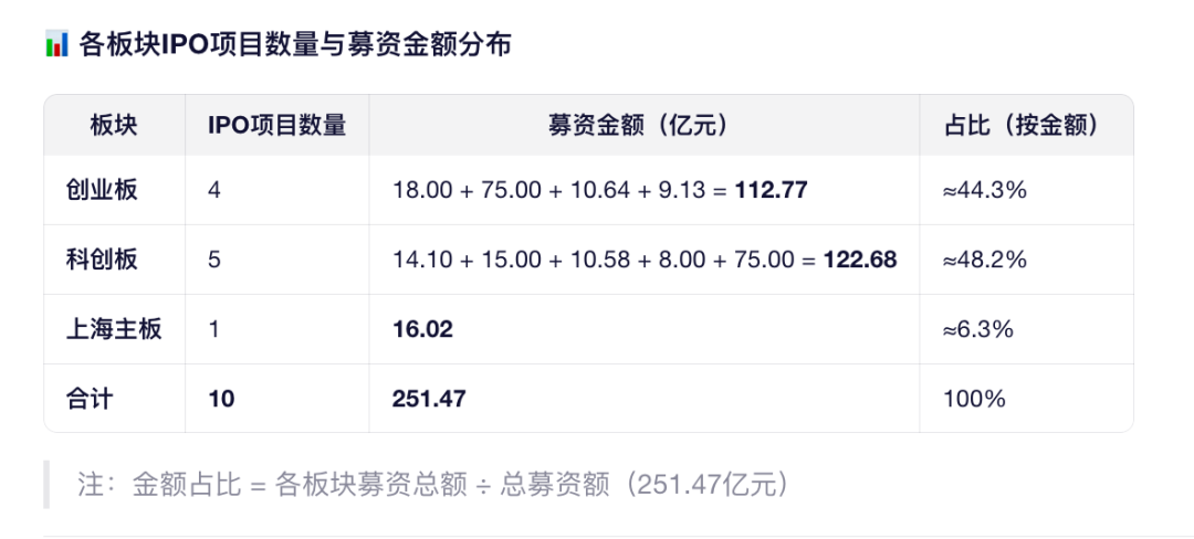 2 、从抽签结果看,创业板 4 家科创板 5 家主板 1 家!主板这次只抽到一家比较幸运。 10 家公司募资总和 251.47 亿,平均 25 亿!