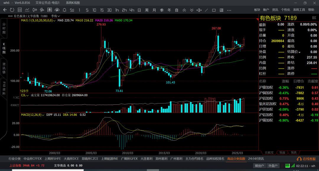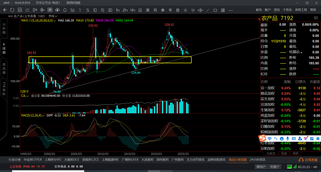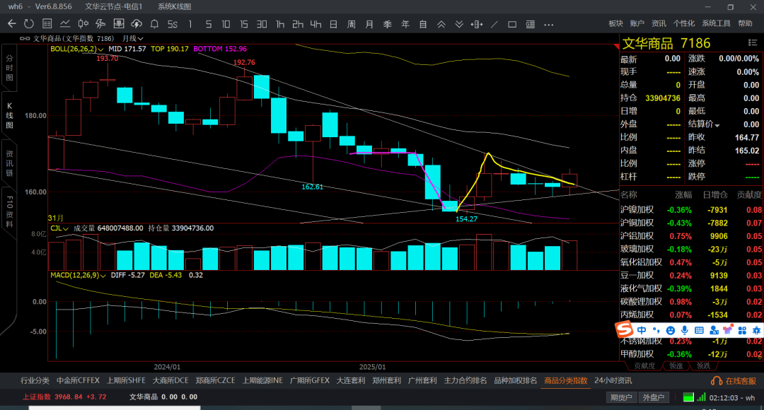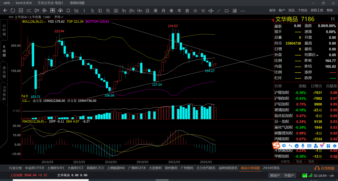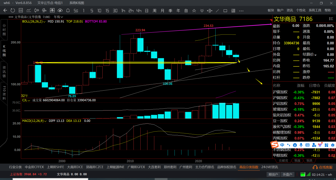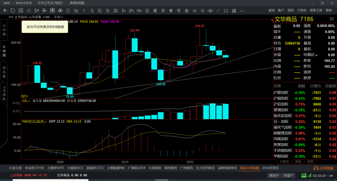 文华商品横盘,然后带跌几个月,在反弹1-2个月,又开始阴跌,追单的基本都得挂了,也就是贵金属,有色还可以,后半年是新能源吧,其他的不是横盘就是阴跌和大跌走势了,月线收敛的都么有波动了,也不知道是市场环境变化了,还是全球憋着大招等着呢,未来几年商品的机会还是会很多,但短线的不好说了,商品持续跌了4-5年时间了,按照商品周期4-8年一个大周期,现在都跌回十年前了。