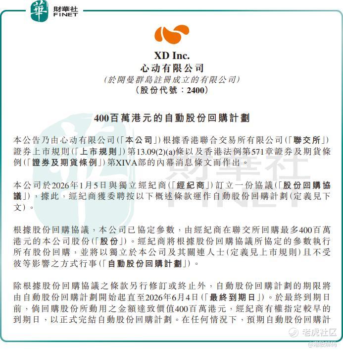 1月5日,心动公司宣布启动一项大规模股份回购计划。公告显示,心动公司于2026年1月5日与独立经纪商签订协议,启动总额4亿港元的自动股份回购计划。该计划将于2026年1月9日前开始,有效期至2026年6月4日。