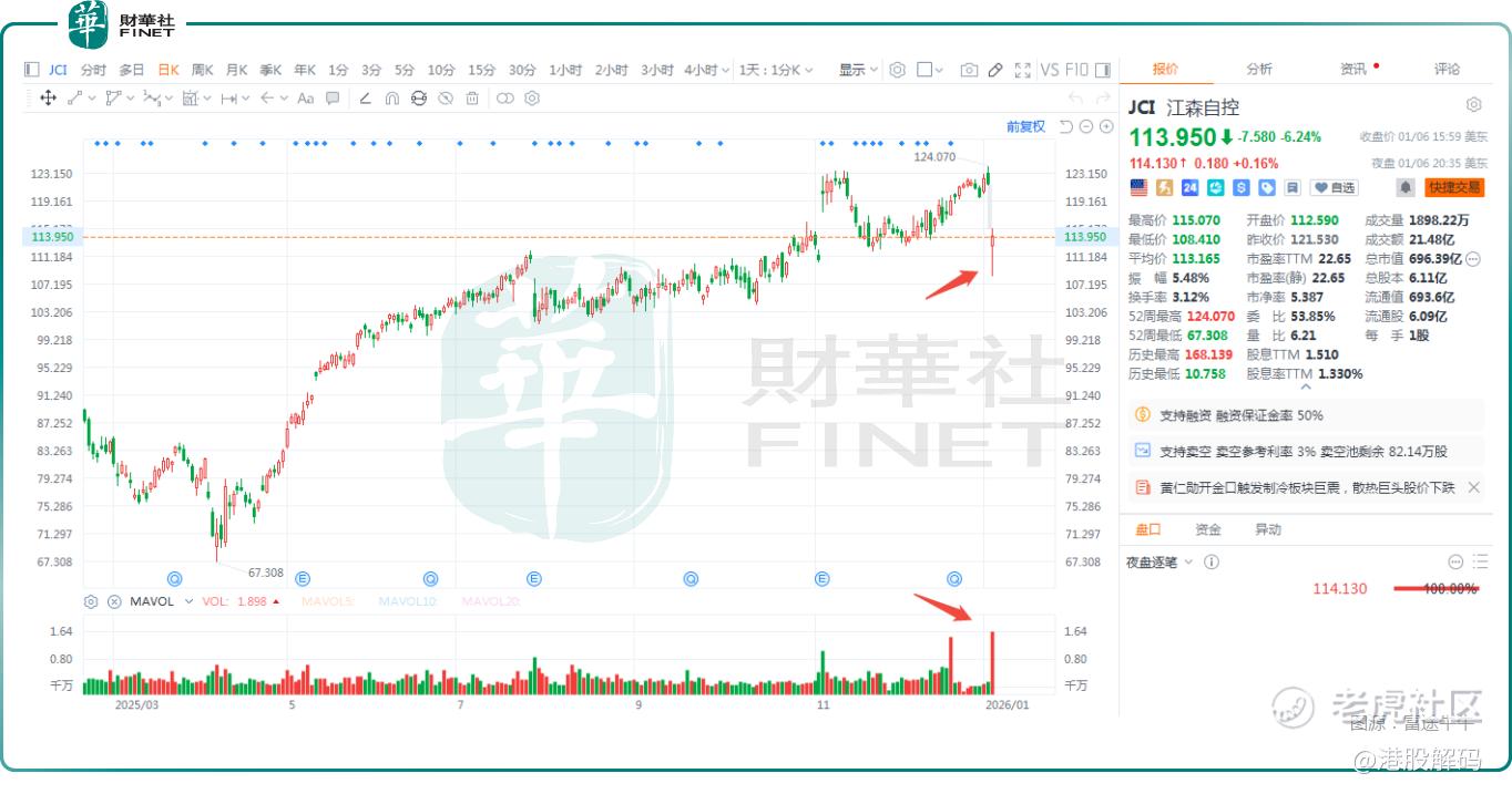 数据显示,周二(美东时间), $江森自控(JCI)$ 一度暴跌近11%,创2022年以来最大盘中跌幅,最终跌幅收窄至6.24%,但成交量出现显著放大; $摩丁制造(MOD)$ 也爆量收跌7.46%;特灵科技(TT.US)同样走低。