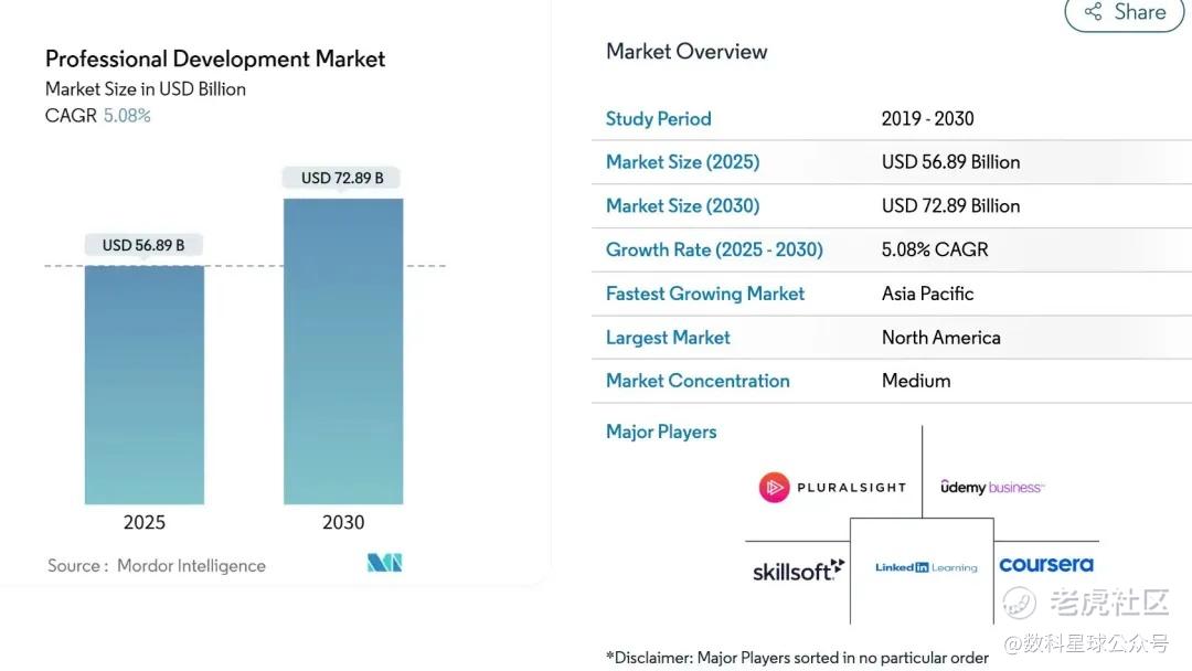 上图说明了该领域的市场规模在2025 年约 568.9 亿美元,2030 年预计达 728.9 亿美元,2025-2030 年的年复合增长率(CAGR)为 5.08%。而北美是当前最大市场,亚太地区是增长最快的市场。在集中度上,目前主要参与者包括 Pluralsight、Udemy Business、Skillsoft、LinkedIn Learning、Coursera 等平台。