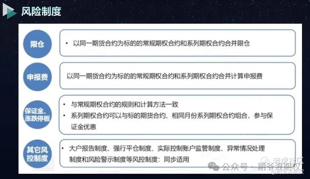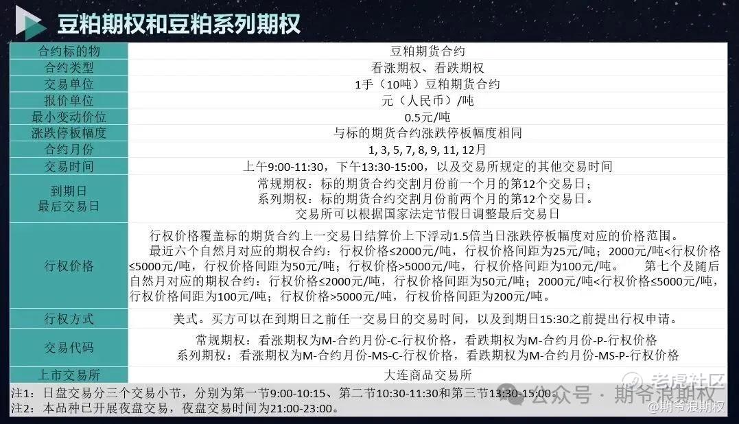 关于豆粕和玉米系列期权的挂牌基准价、行权价、结算价、手续费、行权履约、移仓、限仓、申报费、保证金、涨跌停板,以及其他风险制度等规则,详看下面的图片。