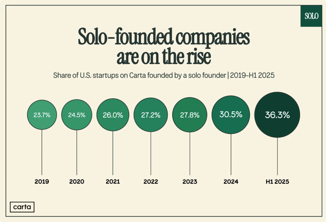 从 2019 年的 23.7% 到 2025 年上半年的 36.3% ,独立创始人创立公司的比例在六年间增长了 53% 。