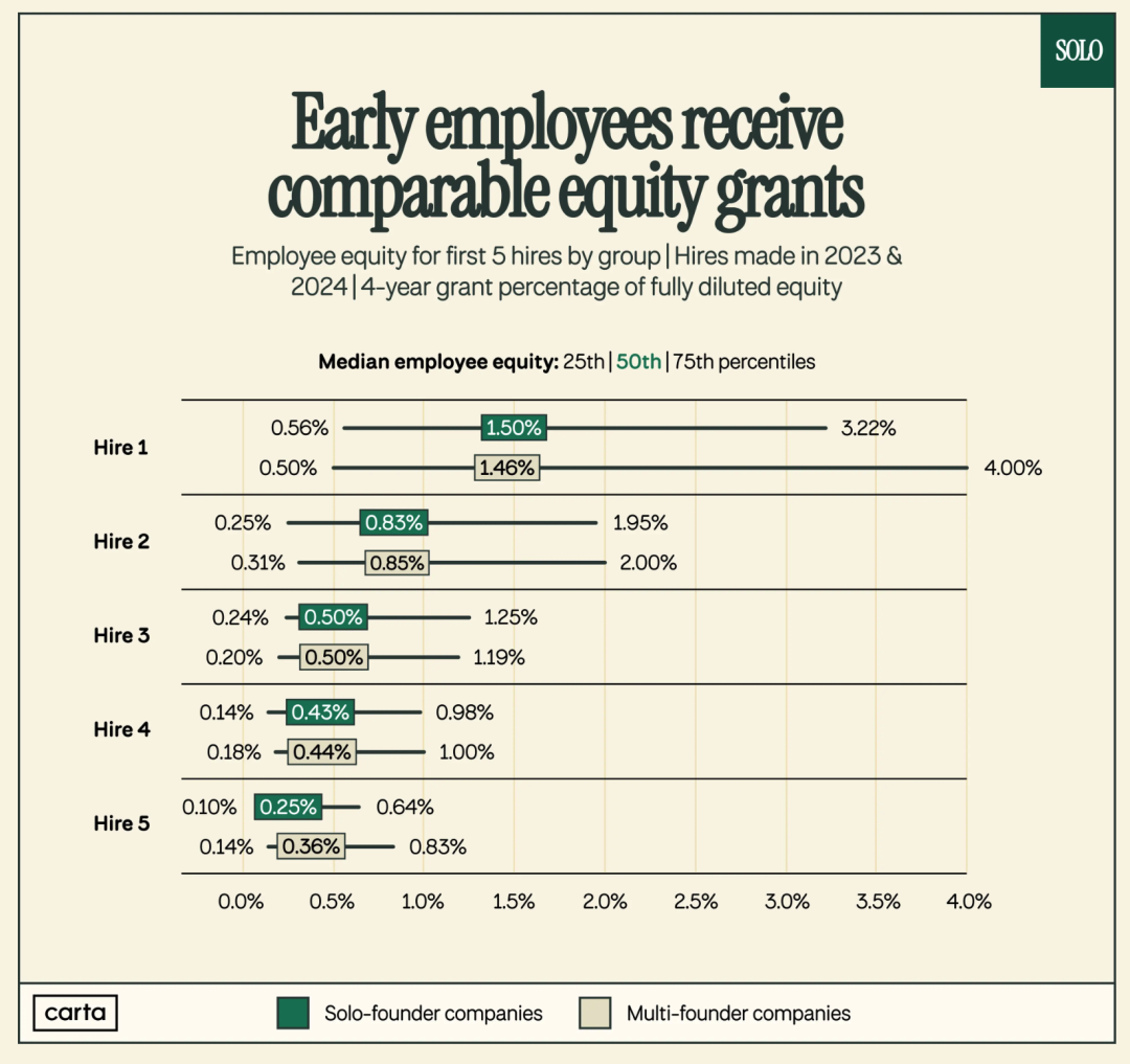 数据也支持这一观点,solofounders 的研究显示,独立创始人公司对早期员工(前 5 名)给予的股权激励中位数与联合创始人公司非常接近。