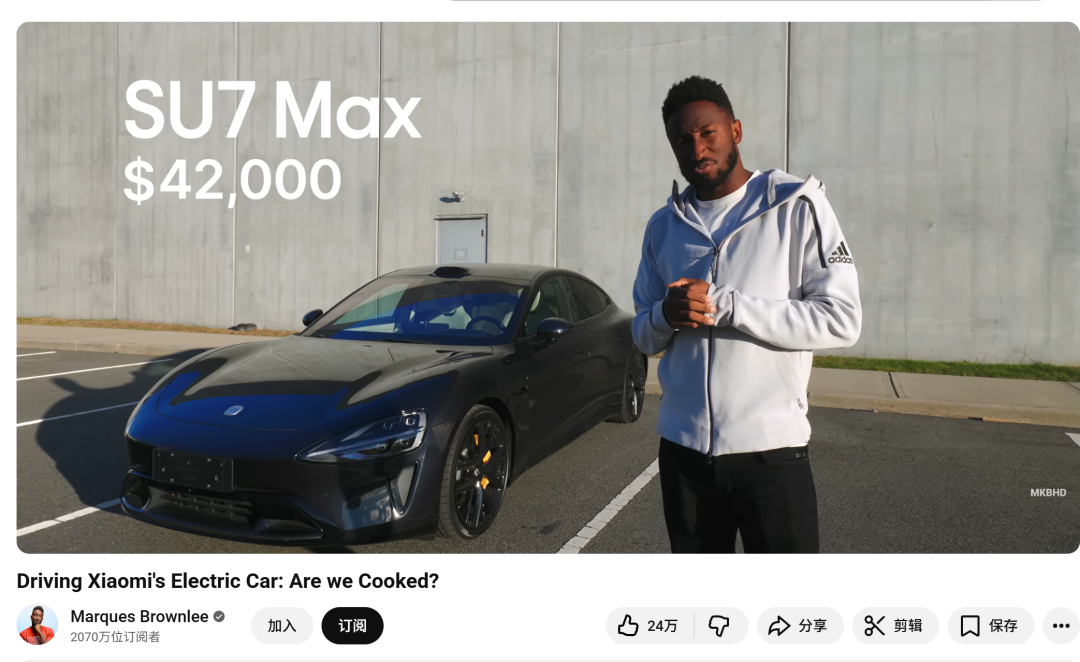 至于和马斯克一样的美国人,当年怎么也不会相信,关税会成为美国汽车市场的守护天使,就在上月,全球顶流科技博主MKBHD,连发两条小米SU7 MAX测评视频,主频道的标题直接就是,“我们要完蛋了吗?(Are we cooked?)”