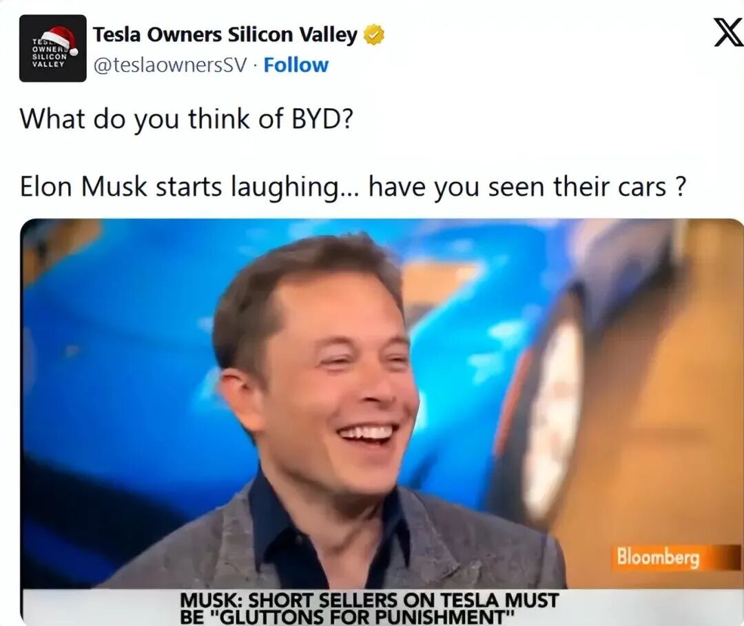 2011年,马斯克在一次采访时被问到,“比亚迪会不会成为特斯拉的竞争对手?”,对着镜头,他的表情有些微妙,并且随后反问主持人:你见过他们的车吗?言语中透着蔑视和不屑,十四年后,比亚迪首次超越特斯拉,领跑全球纯电车市场,甚至在英国和德国也把特斯拉斩落马下。