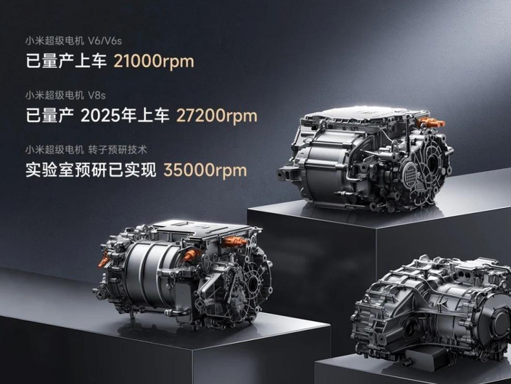 以电机为例,2022年之前,百公里加速2.1秒的Model S Plaid是这个行业里的绝对性能标杆,它搭载了采用碳纤维包覆的电机,最高转速达到了20000rpm,而仅仅过了不到三年,小米推出的V6s电机就打破了这一纪录,去年在小米SU7 Ultra上首发量产的V8s电机,最高转速更是达到了27200rpm。