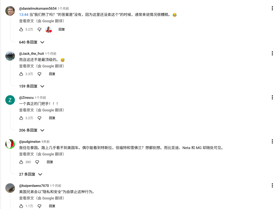 在镜头前,他连连感叹:我不敢相信,这样的配置,这样的性能,这样的智能化水平,只卖4万美元。评论区2.4万条留言里,美国网友们各种冷嘲热讽,满屏尽是对“闭关锁国”的反思。