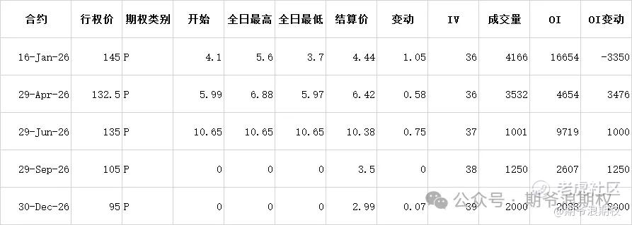 (2)阿里:1月最大持仓范围150-160,窝轮牛熊街货分布135-165,今收142.6,下跌2.26%。期权盘路变化超过1000张的仓位如下,虽然好几个月份的,但都是认沽,而且增仓行权价都是135以下,你品,你细品。马爸爸还是那个马爸爸,买了阿里股票,拿个五年十年,大概率还是涨的。