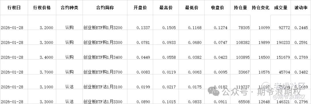 (3)创业板ETF期权:12月最大持仓范围3100-3300,今收3.287,下跌0.72%。期权1月合约,认购和认沽全部都是增仓。认购增仓集中在3100-3700,合计7.4W张;认沽以增仓为主,集中在2800-3500,合计4.7W张。变化超过1W张的仓位如下: